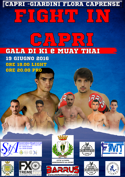 L’Isola Azzurra, luogo prediletto per l’arte, la moda, la musica, oggi vede salire alla ribalta lo sport che sarà protagonista domenica con il primo galà sportivo estivo di arti marziali organizzato dalla Pro Fighting Capri in collaborazione con la Pro Fighting Napoli con il patrocinio dell’Assessorato allo Sport del Comune di Capri L’evento si terrà domenica 19 a partire alle ore 18 nei Giardini della Flora Caprense, al centro dei quali sarà allestito un vero e proprio ring dove si sfideranno grandi atleti provenienti in gran parte dal Nord Italia e dalla Campania, e l’evento di Capri ha richiamato campioni addirittura da Atene, capitale della Grecia. I lottatori si sfideranno secondo le regole del K1 e del Muay Thai, l’antica disciplina meglio conosciuta con il nome di Boxe Thailandese, originaria appunto del paese del Sud Est Asiatico. L’evento sportivo si divide in due fasi quella iniziale a partire dalle 18.00 in cui si disputeranno incontri di categoria Light a contatto leggero, e dopo le premiazioni dei vincitori della prima fase continuerà poi con la categoria Pro con contatto pieno. La presentazione dell’evento e degli atleti che partecipano al galà di Capri si terrà sabato 18 alle ore 19.00.nella Sala Donna Lucia Morgano del Grand Hotel Quisisana, main sponsor della manifestazione. La scenografia dell’evento nel giardino del Centro Congressi di Capri è affidata alla sapiente regia di Fx-Treme di Paolo Caiazzo, mentre Elefantino Sport sosterrà l’evento mettendo a disposizione le particolari protezioni che saranno indossate dagli atleti.