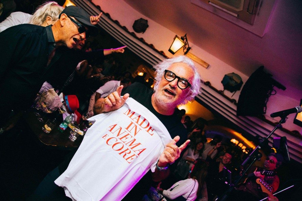 Poi Briatore è salito sul palco con Gianluigi Lembo per intonare «L’ italiano» di Toto Cutugno e, subito dopo, ha messo una mano sul cuore facendo alzare in piedi tutti i presenti nel locale per cantare l’«Inno di Mameli» con tanto di bandiera tricolore sulle spalle.