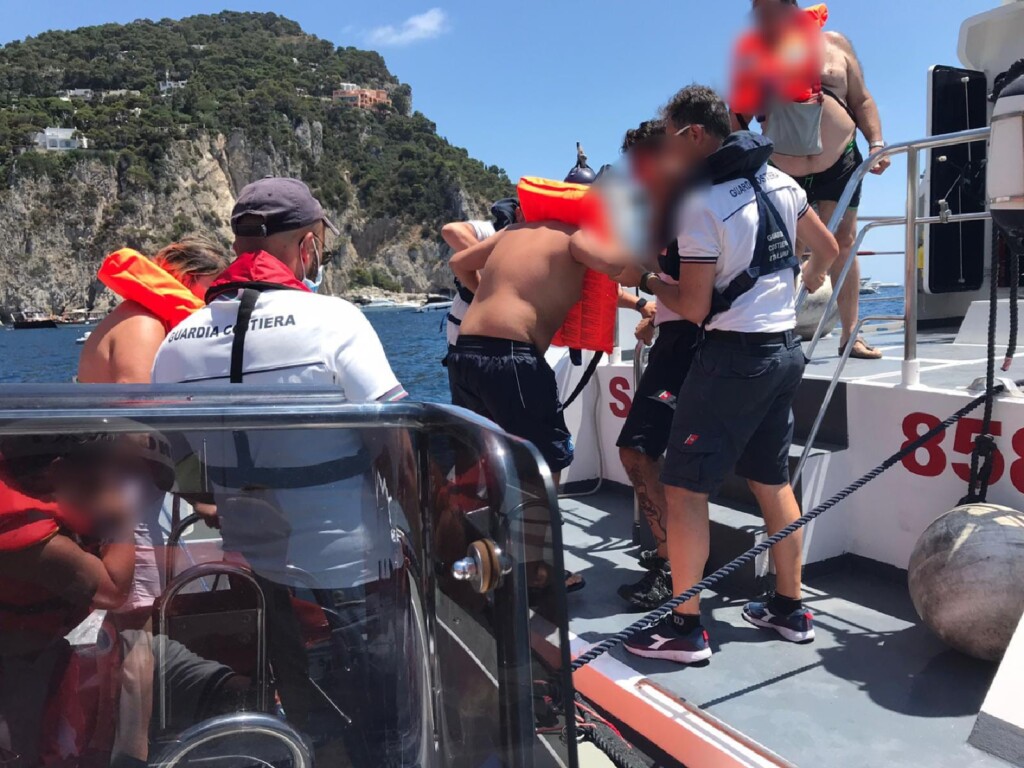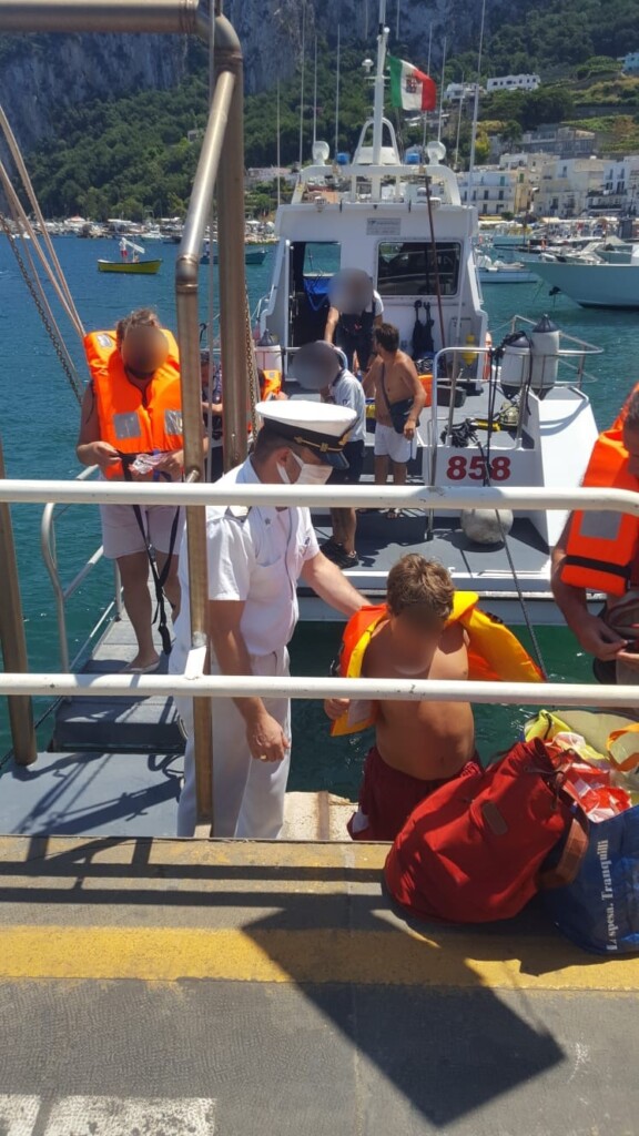 SOTTO IL COORDINAMENTO DEL REPARTO OPERATIVO DELLA DIREZIONE MARITTIMA DELLA CAMPANIA, SI DISPONEVA L’IMMEDIATA USCITA DELLA MOTOVEDETTA CP SAR 858 DELL’UFFICIO CIRCONDARIALE MARITTIMO DI CAPRI CHE IN POCO TEMPO GIUNGEVA IN ZONA, INTERCETTANDO GLI OCCUPANTI (3 PERSONE PROVENIENTE DA CASTELLAMMARE DI STABIA), I QUALI ERANO STATI PRONTAMENTE ASSISTITI DA UN GOMMONE ASSERVITO AGLI STABILIMENTI BALNEARI NELLE VICINANZE E PROVVEDEVA AL TRASBORDO DEGLI STESSI SULLA MOTOVEDETTA, IN BUONE CONDIZIONI DI SALUTE.