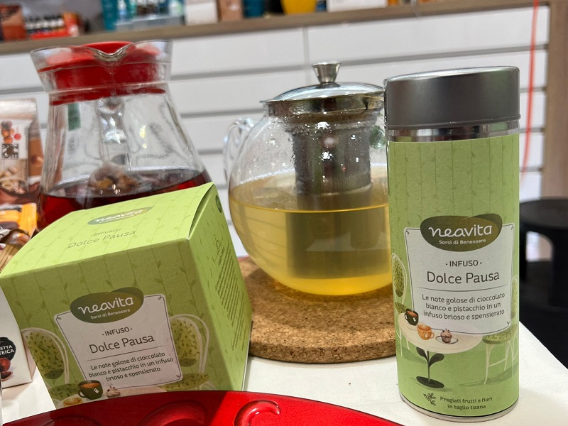 Arancia e Zenzero, un infuso pungente capace di creare un mix perfetto dei profumi mediterranei provenienti delle arance siciliane con i toni speziati orientali dello zenzero asiatico e del pepe rosa, miscela avvolgente dai fiammanti riflessi rubino. E poi una Dolce pausa nel panorama delle tisane: un mix di cioccolato bianco e pistacchio con accenni di frutta esotica; tantissimi snack proteici della linea Dietalab a basso contenuto di zucchero ed elevato contenuto di fibre: un sano e gustoso spuntino per mantenere la linea e il benessere