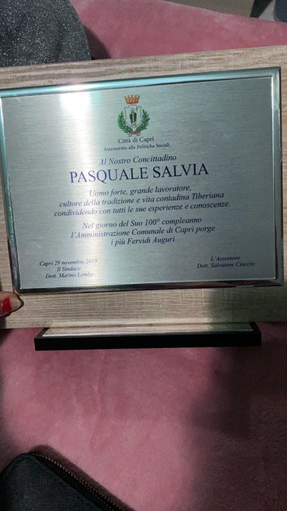 Il Sindaco di Capri Marino Lembo e l’assessore alle Politiche Sociali Salvatore Ciuccio hanno omaggiato il cittadino centenario Pasquale Salvia di Tiberio con la consegna di una targa che riportava la seguente motivazione: Uomo forte, grande lavoratore, cultore della tradizione e vita contadina Tiberiana condividendo con tutti le sue esperienze e conoscenze.