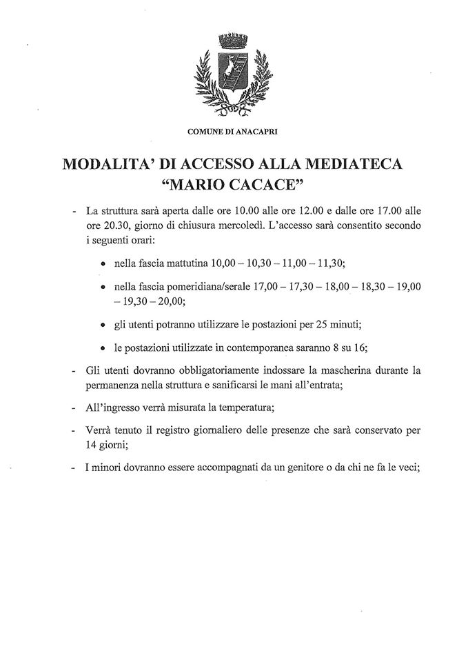 Il 2 luglio riapre ad Anacapri la mediateca M. Cacace: queste le modalità di accesso