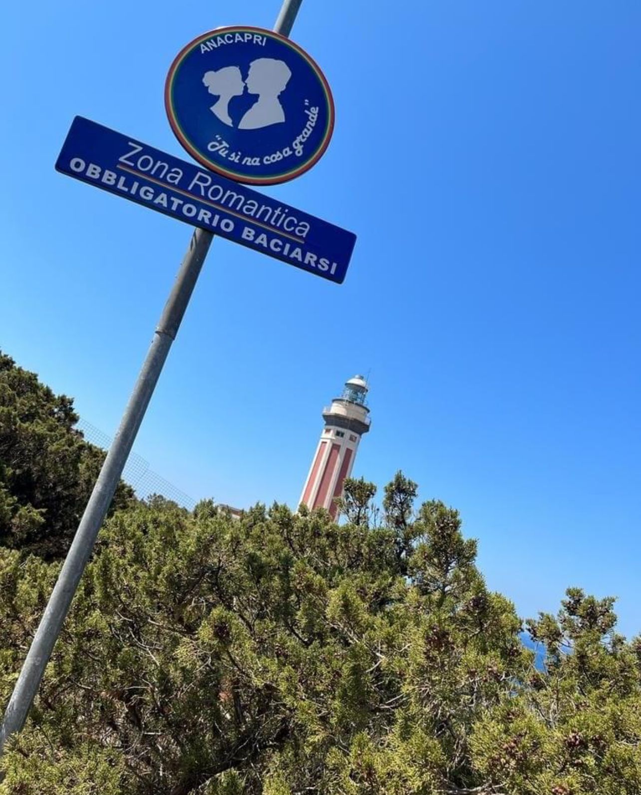 Anacapri. Obbligo di bacio sull’isola dell’amore. Capri o a voler essere precisi Anacapri impone un obbligo ma questa volta nulla di spiacevole nell’isola delle ordinanze ma un ordine perentorio e ben accetto; qui vige l’obbligo di baciarsi, La location eletta a dogana di tale dovere è al Faro di Punta Carena, in prossimità del belvedere del sognatore. Nel piazzale che sovrasta la zona dalle acque più profonde e che custodisce il tramonto più suggestivo e gettonato dello Stivale, ad Anacapri, è stato installato un cartello originale che di fatto come la segna-letica stradale delimita confini e detta obblighi in qualche modo ufficializza l’area come zona romantica. L isola dell’amore, dunque, che ha visto poeti, letterati, grandi personaggi raccontare la straordinaria magia che solo su questo piccolo scoglio in mezzo al mare
