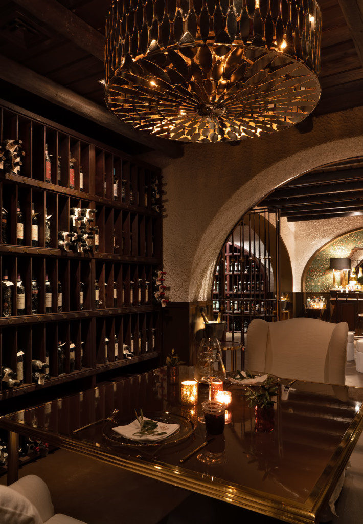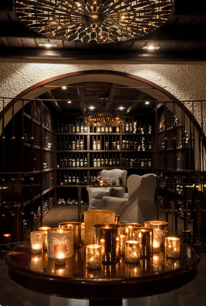Lo spazio concepito ed eseguito dall’architetto Francesco della Femina, con il contributo creativo di Sugokuoii Events, è stato trasformato da antica taverna in una ‘bodega’ molto glam, arredata con un mix di mobili antichi e contemporanei; le luci soffuse e le tantissime candele creano un’atmosfera magica, sofisticata e intrigante. I lampadari sono tagliati a mano nella forma di foglie d’olivo e sono progettati per creare una diffusione dinamica di luci e ombre che si rincorrono e ritraggono tra le preziose bottiglie di vino. I tavoli realizzati su disegno e le poltrone Berger, rivestite in lino bianco, offrono un comfort elegante e opulento.