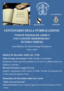 In quest’occasione, sabato 28 dicembre alle ore 17:00, il Centro Caprense Ignazio Cerio e l’Editore Nascimento, con il contributo della Città di Capri, ricorderanno il rapporto tra la Casa Editrice e il poeta cileno attraverso il racconto di Pablo George-Nascimento.