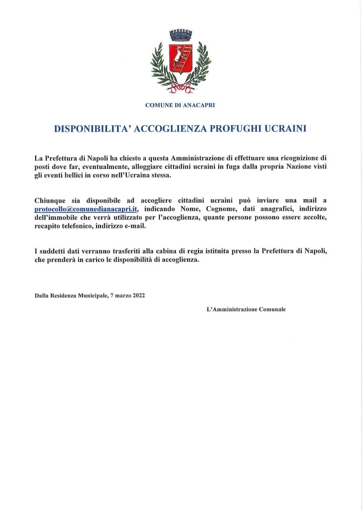 Fonte: Comunicato Stampa – Comune di Anacapri – 7 Marzo 2022