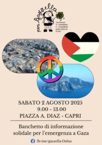 Sabato 2 agosto, dalle ore 9:00 alle ore 13:00, Capri Pro Palestina organizzerà nella sua famosa Piazzetta un banchetto solidale per dichiarare che Capri non è indifferente agli orrori che si stanno perpetrando ai danni del popolo palestinese.