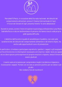 Il Forum dei Giovani di Capri nella Giornata Nazionale dei disturbi del comportamento alimentare, organizza l’incontro “Io sono abbastanza”