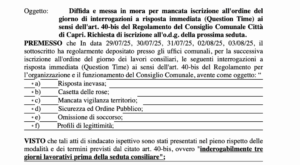 Il Gruppo consiliare “Capri ai Capresi” deposita una Diffida e messa in mora per mancata iscrizione all’ordine del giorno di interrogazioni a risposta immediata (Question Time)