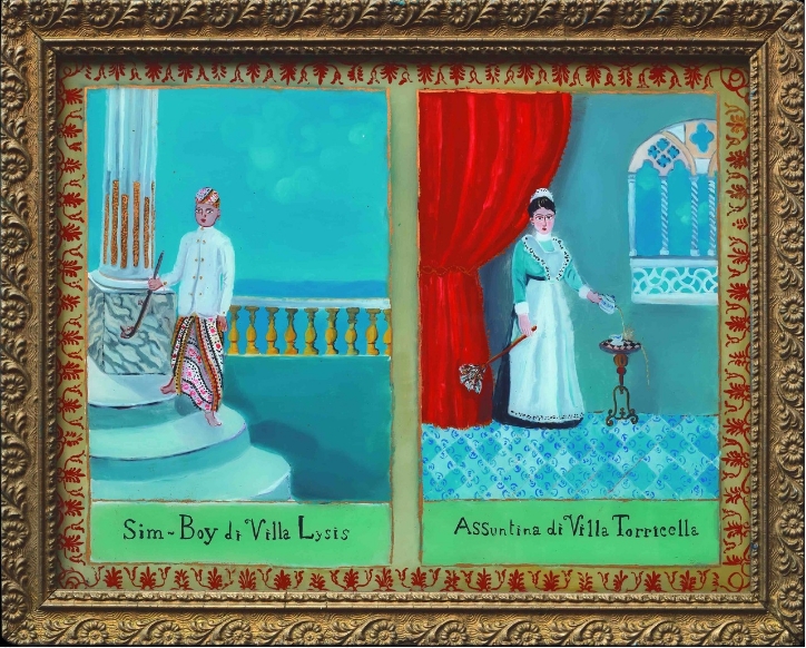 Sopra un’isola, qualunque essa sia, lo sguardo è sempre rivolto verso il mare. Il mare che cambia con le stagioni, che porta lontano gli affetti, da cui arriva il nemico. I vetri delle finestre delle case antiche che affacciano sul mare sembrano intrappolare tutti quegli sguardi. È per questo che Roberto di Alicudi , artista napoletano che ha fatto di Alicudi – cinque chilometri quadrati di terra in mezzo al mare, nell’arcipelago delle isole Eolie la sua casa, dipinge su vetri antichi. «Sui vetri antichi dipingo il mare. Quei flutti salmastri si animano come fiammelle, grazie alla vita che ci è passata attraverso», racconta. La sua mostra Jeunesse d’Amour , a cura di Valentina Rippa e in esposizione a Villa Lysis, a Capri , fino a lunedì, 8 luglio 2024, è un omaggio alle isole della sua vita: Capri, luogo dell’infanzia e dell’adolescenza che dietro la patina glam conserva un’anima imperscrutabile e selvaggia. E le altre isole: Salina, la Sicilia tutta e, ovviamente, Alicudi. Roberto di Alicudi, Grotta azzurra Capri e Alicudi, antitetiche all’apparenza ma complementari nell’opera dell’artista, concretizzano il concetto di esilio a cui Roberto di Alicudi è tanto legato. «Alicudi è stata per me ciò che Capri è stata per il Barone Fersen, proprietario di Villa Lysis e che proprio in questa dimora unica trovò la morte. Capri e Alicudi sono, ognuna a modo suo, luoghi in cui trovare pace ma anche coltivare l’amore per la bellezza, continue fonti di ispirazione artistica e intellettuale». Ogni isola è un modo a sé, con leggi tutte sue e una propria mitologia. Ed ecco che attraverso la fervida immaginazione coltivata in solitudine dall’artista, sirene sguazzano nella grotta azzurra, totani e draghi inseguono marinai disperati e un asinello occhialuto – reminiscenza di un ricordo sbiadito – si candida alla santità in quella che sembra un’immaginetta votiva. Roberto di Alicudi, Scoglio delle Sirene «Così come l’isola è una via di fuga dalla realtà della terraferma, così la pittura su vetro nega tecnicamente tutte le regole della pittura su altri supporti», prosegue di Alicudi. «Dipingere su di un vetro significa dipingere ‘al contrario’: si inizia dai particolari per arrivare, pennellata dopo pennellata, al contesto generale; ciò che dipingi a destra si ritroverà al sinistra. È un modo di guardare il mondo che mi rappresenta». Le opere che compongono Jeunesse d’Amour sono al tempo stesso fortemente simboliche ma anche intensamente autobiografiche. In esse ci sono ricordi, piccoli aneddoti di vita vissuta che grazie alla forza dell’immaginazione si spogliano della nostalgia per diventare altro. «Non sono una persona nostalgica. A volte, semplicemente, il mondo che mi circonda non mi piace. Così ne invento un altro. Lo dipingo su questi vetri e lo guardo con i miei occhi. È un modo per aggiungere ilmio sguardo ai tanti rimasti lì intrappolati nel tentativo di raggiungere il mare».