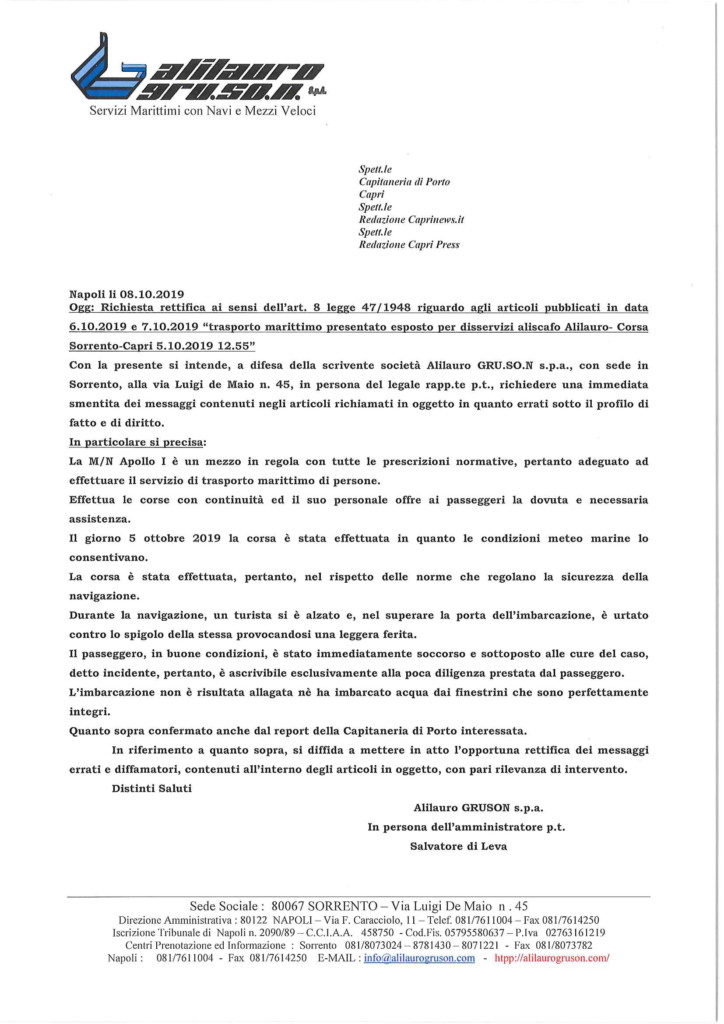 Su richiesta di Alilauro Gruson, pubblichiamo la rettifica della stessa compagnia di navigazione sull’incidente occorso ad un passeggero sabato 5 ottobre scorso a bordo dell’aliscafo Apollo 1.