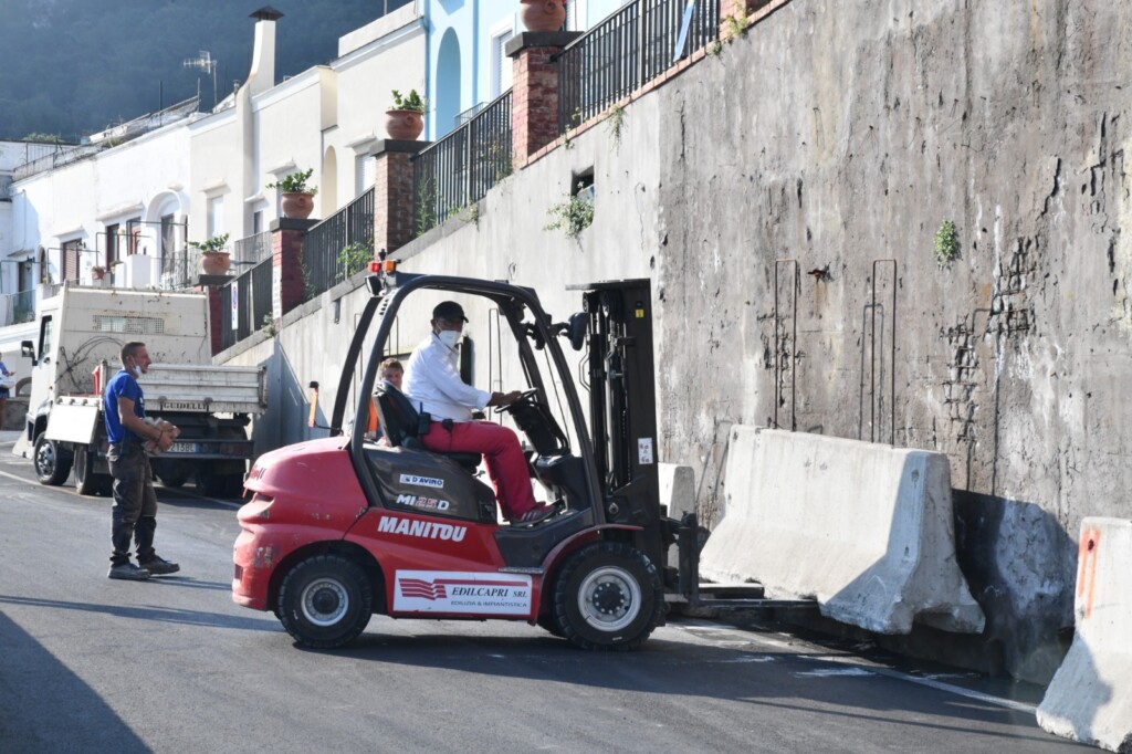 cemento per creare una doppia corsia di marcia sulla strada provinciale che viene attraversata quotidianamente da taxi, navette degli alberghi, pullmini di portabagagli, auto private dei residenti ed automezzi che trasportano le merci sia a Capri che ad Anacapri.