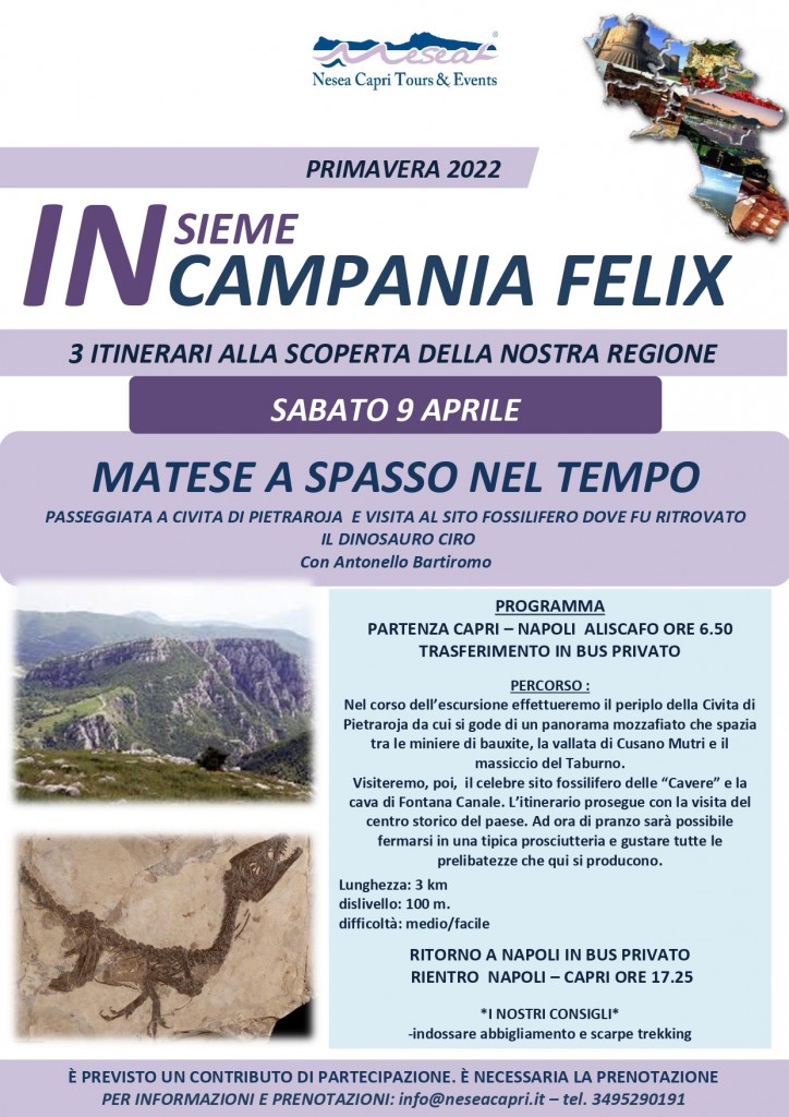 Nel corso dell’escursione effettueremo il periplo della Civita di Pietraroja da cui si gode di un panorama mozzafiato che spazia tra le miniere di bauxite, la vallata di Cusano Mutri e il massiccio del Taburno. Visiteremo, poi, il celebre sito fossilifero delle “Cavere” e la cava di Fontana Canale. L’itinerario prosegue con la visita del centro storico del paese. Ad ora di pranzo sarà possibile fermarsi in una tipica prosciutteria e gustare tutte le prelibatezze che qui si producono.