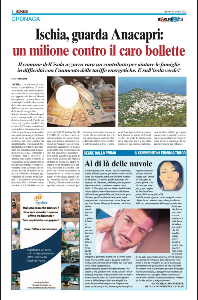 prossimamente scaricabile il bando contenente tutte le informazioni utili per accedere al contributo. Una simile iniziativa, da parte di un comune di meno di settemila abitanti, in favore dei propri residenti in un momento così critico, richiama alla mente l’appello che le varie associazioni di imprenditori e commercianti hanno rivolto alcuni giorni fa alle amministrazioni dell’isola d’Ischia, affinché riuniscano i rispettivi consigli comunali per elaborare soluzioni concrete di fronte all’incombente inverno che vedrà diverse imprese e tante famiglie alle prese con bollette astronomiche. Certo, il comune di Anacapri avrà forse risorse ben diverse da quelle dell’isola verde, ma viste le dimensioni della crisi che già si è profilata anche nei sei comuni ischitani, non sarebbe affatto peregrino pensare che le rispettive amministrazioni mettano in campo risorse dirette a tamponare le esigenze primarie dei cittadini.