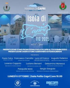 Lunedì 6 ottobre alle ore 10.00, nella sala Pollio, presentazione dello stand promozionale dell’Isola di Capri per la partecipazione all’edizione 2025 del TTG Travel Experience di Rimini. Parteciperanno il sindaco di Capri, Paolo Falco; il sindaco di Anacapri, Franco Cerrotta; il direttore delegato dei Musei e dei Parchi Archeologici di Capri, Luca di Franco; il presidente di Federalberghi Isola di Capri, Lorenzo Coppola; il presidente di Ascom Capri, Luciano Bersani; il presidente di Ascom Anacapri, Gelsomina Maresca; il preside dell’Istituto Axel Munthe, Pasquale Iezza e il presidente onorario di Federalberghi Isola di Capri, Sergio Gargiulo.