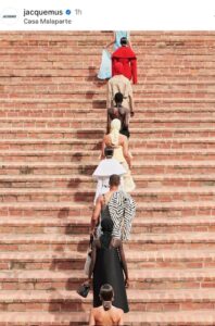 Simone Porte Jacquemus e Capri: è la love story dell’estate. Per il quindicesimo anniversario della sua maison, lo stilista francese ha messo su uno dei fashion show più attesi di stagione: La Casa. In un lunedì di sole, con lo sfondo del mare caprese, Simone ha presentato le creazioni della collezione P/E 2025 in una location d’eccezione, Casa Malaparte, luogo diventato iconico grazie a Michel Piccoli e Brigitte Bardot nel film Il disprezzo (1963). Dalla scalinata su cui la coppia del cinema si guardò l’ultima volta, i modelli sono arrivati sulla suggestiva terrazza con vista sui Faraglioni. Trasparenze, sete, abiti sinuosi, gonne a ruota e maxi scollature sulla schiena. Una linea che richiama al passato spensierato della Dolce Vita dell’isola caratterizzata da tratti contemporanei. La collezione La Casa di Jacquemus ha celebrato l’atmosfera fresca e vacanziera. Il bianco accostato all’azzurro del mare e al giallo dei limoni dell’isola, le stampe colorate aggiungono allegria. L’essenza è quella dell’eleganza effortless e al contempo originale, il tratto artistico di Jacquemus che ha sposato Capri. Come da tradizione, il designer non ha scelto la location della sfilata a caso: dopo i giardini di Versailles e le saline della Camargue, ad Arles, questa volta si è affidato al suggestivo gioiello architettonico arroccato su Punta Massullo e con uno splendido affaccio sui Faraglioni. Affascinante e ricercata da essere scelta per diverse campagne pubblicitarie di moda, da quella della collezione di alta gioielleria di Louis Vuitton a uno docu-film di Saint Laurent, la villa fu commissionata dallo scrittore Curzio Malaparte ed è un progetto di Adalberto Libera, uno degli architetti più rappresentativi del Movimento Moderno italiano. Costruita tra il 1937 e il 1942, Casa Malaparte è iscritta nel Registro delle Opere sotto la protezione del MIBAC (Ministero per i Beni Culturali e Ambientali).