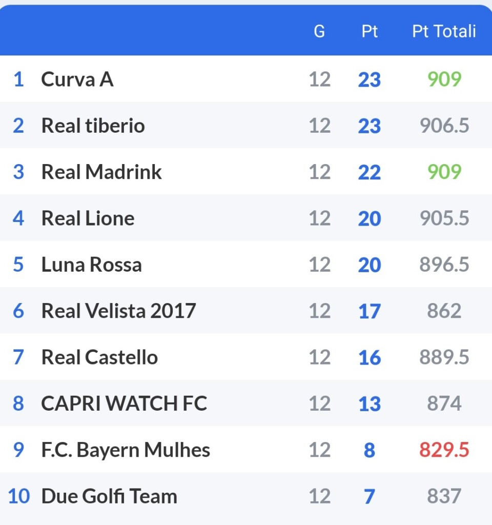 La squadra di Giuseppe Fiorentino passa tre a zero in casa di Due Golfi e raggiunge Curva A in testa alla classifica. Il Real Tiberio va avanti con Zielinsky e la chiude con Joao Pedro e Pinamonti. Clamorosa la classifica di Due Golfi, i tre scudetto di fila sono un ricordo, ora Fabrizio Cataldo deve fare un impresa per restare in Serie A. Perde la seconda gara di fila Curva A che cede ad un ottimo Real Lione. La gara finisce 5 a 2 e lancia la squadra di Mario Lionetti a meno tre dalla vetta. Deve frenare anche il Real Madrink che perde 3 a 1 in casa di Capri Watch. Cristian Aversa rimane comunque a meno uno. Anche Luna Rossa può dire la sua dopo il successo per 3 a 1 contro il Bayer Mulhes. La classifica pone anche Luna Rossa in piena zona coppe a testimonianza di un campionato apertissimo. Giornata chiusa dal pari 2 a 2 tra Real Castello e Real Velista.