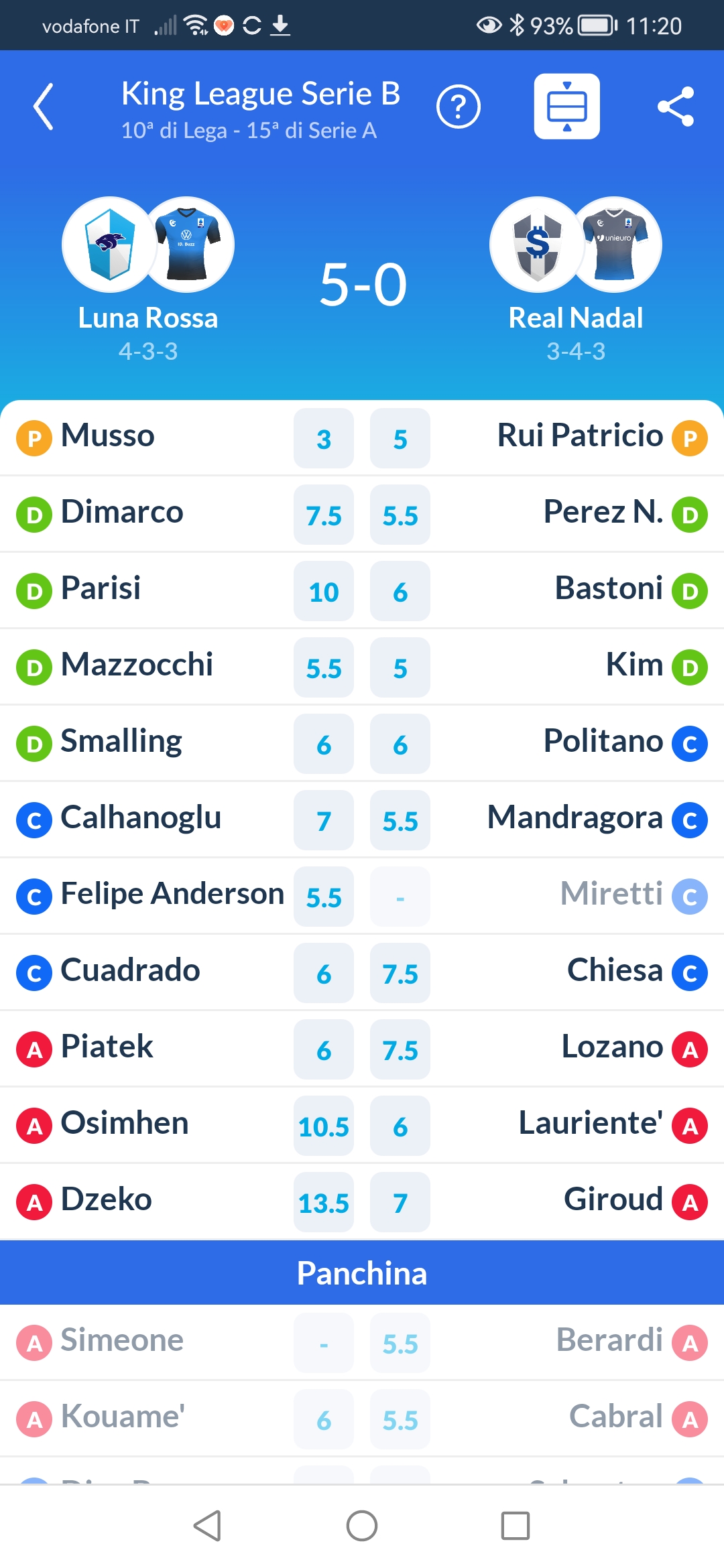 Si erano fermate la settimana scorsa; le squadre che dominano la classifica di Serie A hanno subito ripreso il cammino. Curva A, capolista a +5, in testa nel proprio gruppo di Coppa dei Campioni e campione in carica, passa 2 a 0 in casa del Real Lione che dopo un buon avvio adesso ha frenato bruscamente. Curva A avanti con Parisi e chiude con il solito Osimhen. Bella vittoria di Due Golfi che resiste nella scia della capolista grazie al 4 a 2 rifilato a Mulo che era riuscito a ribaltare con Dzeko lo svantaggio iniziale dovuto al gol di Elmas. Ci ha pensato Nzola a consegnare a Fabrizio Cataldo 3 punti d’oro. Pessina, Arnautovic e Lookman spingono Capri Watch alle spalle delle due che comandano. 3 a 1 al Real Madrink. Con gli stessi punti di Capri Watch c’è il Real Velista che si è ripreso dopo un avvio in sordina ed ha sconfitto, grazie a Carlos Augusto, Cocco Utd. Infine pari 1 a 1 tra Panchester, sesta e Real Castello settima. Si riprenderà con il big match Curva A/Due Golfi che può assegnare subito un pezzettino di scudetto.