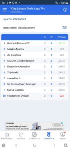 Due squadre in testa in Lega Pro. Nessuna sorpresa per quanto riguarda Magico Mattia, 2 a 1 su Savardina, la sorpresa del momento è sicuramente Gabbrielebbasta di Gabriele Di Martino, a lungo sbeffeggiato all’asta per ogni suo acquisto, ma che al momento comanda la graduatoria. Lukaku, Chiesa e Dimarco firmano l’uno a tre in casa di Ac Ciughine. Prima storica vittoria per Ssc Don Giobbe, Pasalic e Pinamonti premiano Costanzo Sanna in casa del Deportivo Arancino. Prime vittorie in campionato per GCA e Triplete. Gabriele Astarita ringrazia Bonaventura e Osimhen e piega Masterchef. Leonardo Gargiulo batte La Guardia, ancora fermo a zero, con Leao ed Immobile. Trasferta in casa di Masterchef per Magico Mattia.