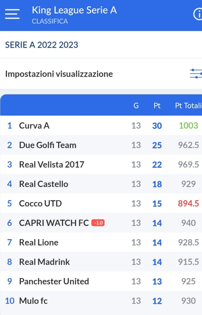 Nella giornata numero 13 Curva A e Due Golfi vincono le proprie sfide e continuano la lotta scudetto con il vantaggio, per ora, di 5 punti a favore dei Campioni di Lega. Proprio Curva A vince la sua gara per il rotto della cuffia, 4 a 3 contro un combattivo Panchester. Decisivo Osimhen, ma decisivo anche il fattore campo 2,5 destinato a chi l’anno prima ha vinto il campionato. Risponde Fabrizio Cataldo che supera in trasferta 4 a 2 il Real Lione nonostante la prestazione di Kvara che aveva subito indirizzato il match. Salgono le quotazioni anche del Real Velista che leggitima il terzo posto con un vantaggio di 4 punti sul gruppo delle altre squadre. Dybala trascina Andrea D’Apice al successo 4 a 3 contro Capri Watch, penalizzato di un punto in classifica per il mancato invio in Interlega. Grazie a Leao il Real Castello passa 1 a 0 in casa di Mulo e si afferma al quarto posto che assegna un posto nel primo turno preliminare di Coppa dei Campioni. Infine vittoria scacciacrisi per il Real Madrink che in casa surclassa Cocco 4 a 0. In coda classifica molto corta che gioco forza mette tutti in corsa salvezza. Real Castello/Curva A è un crocivia della giornata 14.