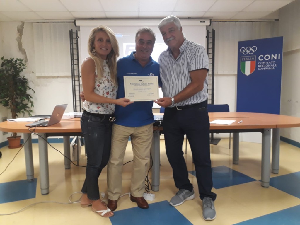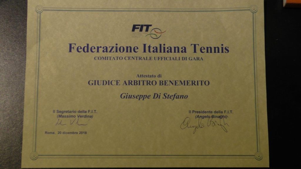 Martedì 24 Settembre 2019, presso la sede del CONI (Comitato Olimpico Nazionale Italiano) di Napoli, la Federazione Italiana Tennis ha conferito un attestato di benemerenza al Giudice Arbitro Internazionale Giuseppe Di Stefano, nella foto premiato da Maria Cristina Barbarano, giudice arbitro internazionale gold badge; e da Federico D’Atri, ex Presidente del Comitato Regionale Campania