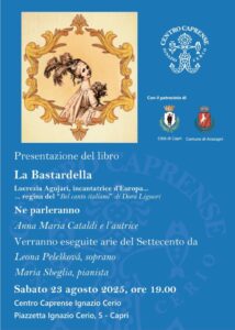 Sabato 23 agosto alle ore 19:00, il Centro Caprense Ignazio Cerio ospita un evento omaggio a Lucrezia Agujari, conosciuta come “La Bastardella” per le sue origini incerte. Soprano di coloratura tra le più celebrate del Settecento, Agujari si distinse per l’eccezionale estensione vocale, la raffinatezza tecnica e l’intensità espressiva, conquistando i teatri d’Europa e l’ammirazione di compositori come Mozart.