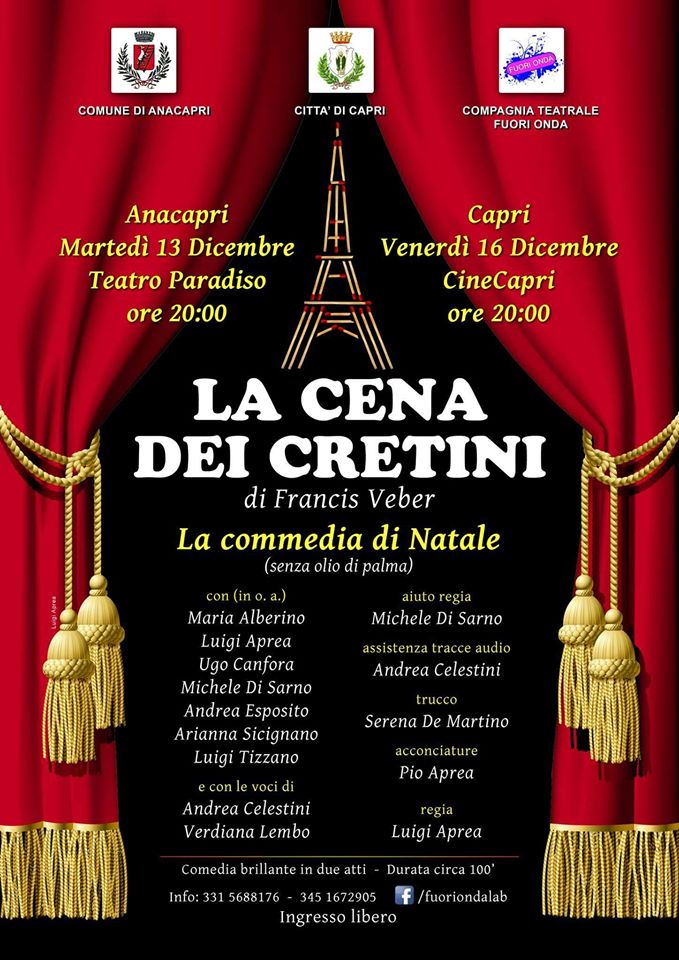 Torna il teatro a Capri con la Compagnia Teatrale Fuori Onda e la commedia brillante “La Cena dei Cretini” di Francis Veber domani, venerdì 16 dicembre, alle ore 20.00, presso il “CineCapri” ai Giardini della Flora Caprense.