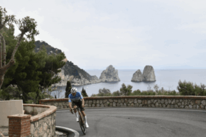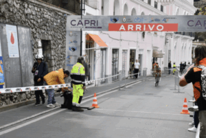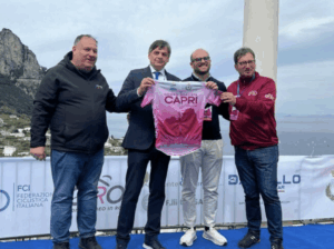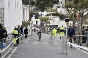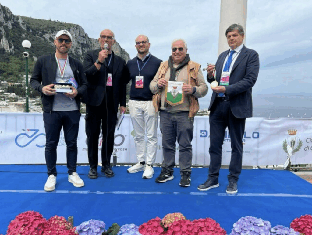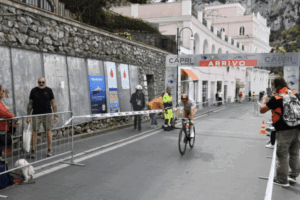La premiazione che è avvenuta all’ombra dello storico campanile del salotto del mondo ha attratto la curiosità di tanti stranieri e vacanzieri che hanno seguito anche la gara nei percorsi dedicati. Grande soddisfazione anche per quest’obbiettivo raggiunto è stato espresso in un breve intervento da parte degli organizzatori: È stata un’emozione unica – hanno affermato Salvatore Belardo e Francesco Vitiello – resa possibile dal pieno supporto dell’amministrazione comunale, che apre le porte a nuove e più affascinanti esperienze nel campo dello sport del pedale”. Le conclusioni al Sindaco di Capri Paolo Falco che ha plaudito all’iniziativa e ha dichiarato: “Abbiamo voluto lanciare da Capri, l’isola più internazionale del mondo, un messaggio di pace attraverso lo sport, in un periodo in cui il contesto internazionale è estremamente preoccupante”. Sorride Sonny Colbrelli, ultimo italiano ad essersi aggiudicato il campionato europeo di ciclismo (sempre nel 2021, anno in cui vinse anche la Parigi-Roubaix). “È stata la mia prima volta a Capri: è una location fantastica. Sono contento di averlo fatto partecipando, in qualità di testimonial, alla prima edizione di questa cronoscalata, durante la quale mi sono confrontato con tanti amanti del ciclismo”. Con lui un altro ex professionista, Lello Ferrara, che ha immortalato le immagini salienti dell’evento, diffondendole sui suoi canali social. La Cronoscalata di Capri, dai faraglioni alla piazzetta, che vedrà sfilare anche il prossimo anno le bici lungo i tornanti delle strade panoramiche capresi è entrata a pieno titolo così come ha preannunziato il sindaco, nel corso del suo intervento, un altro appuntamento annuale nel carnet degli eventi che vedono Capri meta preferita di tante discipline sportive.