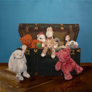 I protagonisti delle opere in mostra sono quattro personaggi curiosi, Zac il coniglio, Billy l’orsetto, Dart il cavallo e Gilda l’ippopotamo, che insieme partono alla scoperta di una nuova vita al di fuori del loro baule, che rappresenta un porto sicuro, il nido, la casa. Il fil rouge che percorre tutti i dipinti, infatti, è il desiderio di stupirsi di nuovo, di fuggire dalla monotonia della zona di comfort per riscoprire una vita più “dolce”, spensierata e leggera, ma non per questo superficiale.