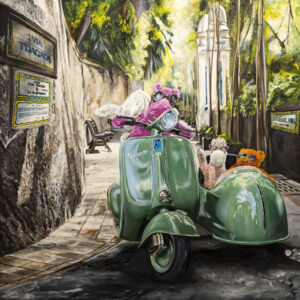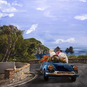 A partire da “Escape“, la tela che ritrae i quattro protagonisti ancora all’interno del baule, emerge subito la vivacità dei colori e la spontaneità con cui Carla Chiusano ha deciso di rappresentare i propri personaggi. Il viaggio alla ricerca di un’allegria sincera inizia con “Dolce Vita“, la fuga dalla noia del conosciuto verso il brivido dell’ignoto. Nel loro riuscito tentativo di evasione i simpatici personaggi de “La Dolce Vita”, catapultati al sole dell’ isola azzurra, vengono ritratti alla guida di una macchina d’epoca, sullo sfondo gli ormai noti faraglioni.