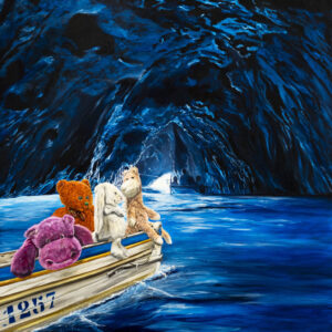 In tutti i dipinti, infatti, insieme ai pupazzi, vengono celebrati i luoghi più iconici di Capri, tra questi anche la piazzetta, raffigurata in “The Office“, o la meravigliosa Grotta Azzurra, riprodotta con estrema precisione e cura dal pennello di Chiusano in “Nel blu dipinto di Blu“. La narrazione de “La Dolce Vita” si conclude con “Tragara“, un omaggio alla bellezza spontanea dell’isola e a tutti gli artisti che hanno vissuto il fascino di questa via, fortemente ammaliati dalla sua poeticità. Una passeggiata che è stata percorsa da poeti, scrittori e pittori e che ancora oggi attrae e ispira la potenza del genio creativo.