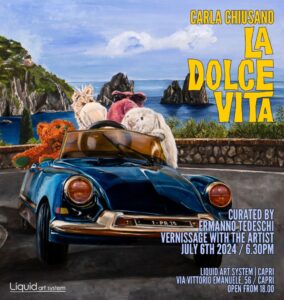 Sabato 6 luglio a Capri, presso la galleria di arte contemporanea Liquid Art System di Franco Senesi, inaugura la personale “La Dolce Vita” di Carla Chiusano, a cura di Ermanno Tedeschi. La mostra racconta il favoloso immaginario dell’artista, che in ogni quadro, tra colori sgargianti e ambientazioni iconiche, ha dato forma alla gioia di vivere e all’energia creativa che da sempre contraddistinguono l’isola di Capri e che l’hanno ispirata e incantata.