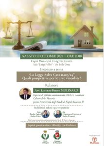 Questi ed altri temi interessanti, legati alla recente approvazione della nuova normativa, saranno trattati dall’avvocato Lorenzo Bruno Molinaro nella conferenza organizzata per sabato 19 ottobre 2024 presso la sala “Luigi Pollio” del Centro Congressi di Capri, cui seguiranno “question time” e dibattito con il pubblico.