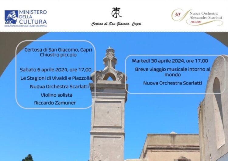 Un concentrato di suggestioni musicali nei due appuntamenti concertistici del 6 e 30 aprile 2024, che vedranno la Nuova Orchestra Scarlatti esibirsi nel Chiostro piccolo della Certosa di San Giacomo a Capri, organizzati dalla Direzione regionale Musei Campania in collaborazione con la Nuova Orchestra Scarlatti e con il sostegno dell’Associazione L’Oro di Capri.