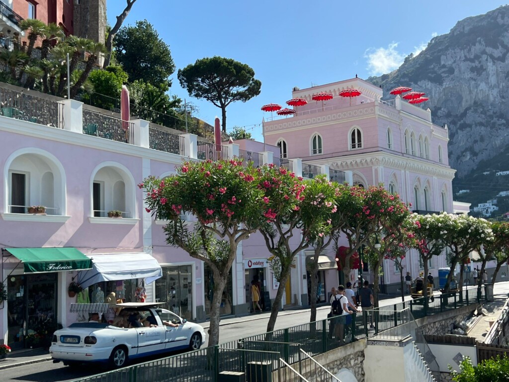 Nelle elegantissime e comfprtevoli camere niente televisione e niente frigobar. Un buon drink si può sorseggiare in terrazza, e con la vita e la bellezza di Capri si può fare a meno del piccolo schermo. Il nuovo concept che lancia anche nuovi stili di vita, con questo palazzo neogotico con un’ ampia facciata che chiude come una quinta di teatro via Roma, le finestre a bifora, le balconate panoramiche e con le sue 21 camere rosa cipria, la piscina sul tetto e il ristorante sotto il colonnato battezzato Vesuvio e la sottostante discoteca non a caso chiamata Rumore, diventerà un’ altra perla dell’ ospitalità isolana. Un luogo iconico perfetto per i turisti francesi, ma anche per quelli alternativi che possono permettersi, grazie al loro status, di trascorrere una vacanza a Capri vissuta in maniera diversa.