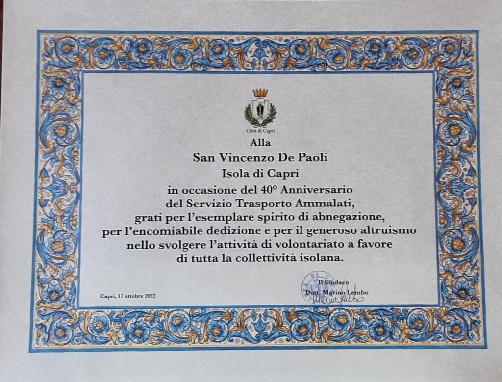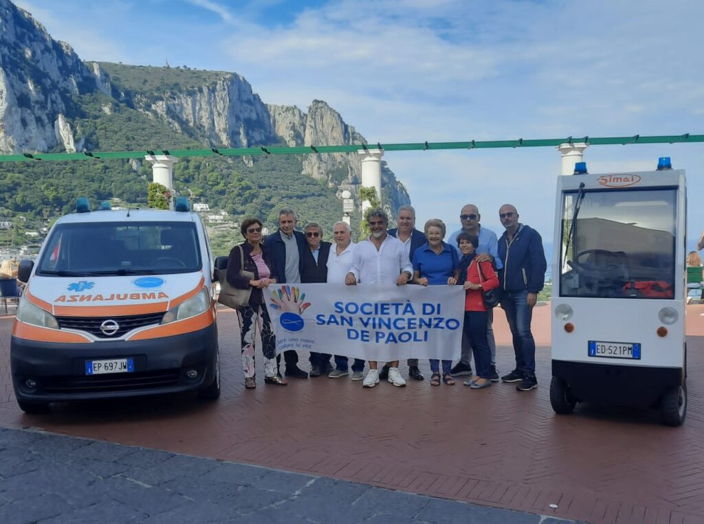 Compie il suo primo trasporto il 10 Gennaio 1979. In una sala affollata dalle istituzioni, tra cui il Sindaco Marino Lembo i soci, la Presidente Carmela De Martino e il comitato direttivo, insieme ai volontari e ai tanti isolani che spendono il loro impegno a favore dei loro compaesani bisognosi di cure, è stato ricordato l’impegno profuso dalla San Vincenzo in questi anni per arrivare ai progressi ottenuti sino ad oggi con grande impegno sociale. Nel 1982 viene donata alla San Vincenzo De Paoli dalla Famiglia Messanelli in memoria dell’Arcivescovo Monsignor Carlo Serena, nativo di Capri, un’ambulanza FIAT900 a motore che va ad integrare il trasporto sull’isola per le strade provinciali e per collegare il Comune di Anacapri al quale successivamente verrà donata un’ambulanza a motore da parte della Congrega dell’Immacolata, ancor’oggi attiva. L’evento, una vera e propria convention sanitaria, fatta da tutti cittadini, volontari e soci della San Vincenzo si è concluso con il Sindaco di Capri Marino Lembo che ha consegnato una pergamena ufficiale del Comune alla Presidente della San Vincenzo Carmela De Martino, per l’impegno profuso nel corso della sua presidenza e della San Vincenzo nel corso di tanti decenni a favore dei più deboli. Un gesto simbolico, ma significativo, verso un’associazione che spende gran parte del suo tempo e delle sue energie per alleviare le sofferenze della cittadinanza che dimora sull’isola. Ad anticipo alla premiazione c’è stata una carrellata di immagini e video d’epoca proiettate sul grande schermo della Sala Cinema che hanno mostrato le condizioni della sanità dell’’epoca ed i progressi raggiunti in questi anni anche grazie all’associazioni di volontariato e tra queste la San Vincenzo De Paoli Capri.