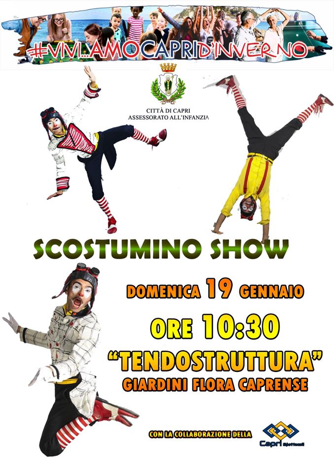 Ancora una domenica mattina da trascorrere in allegria per i bambini di Capri. Questa volta l’appuntamento organizzato dall’Assessorato all’Infanzia della Città di Capri è con “Scostumino Show”, domenica 19 gennaio alle ore 10.30 nella Tendastruttura dei Giardini della Flora Caprense.