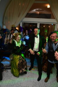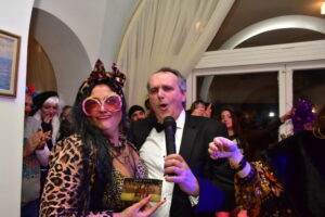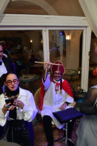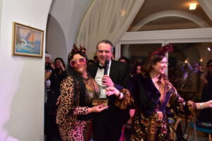 L’atmosfera ha vissuto una metamorfosi magnetica. L’inizio, sospeso tra le suggestioni del Grande Gatsby e le estetiche de La Grande Bellezza, è stato cullato dalle note raffinate di un pianoforte. Il ritmo è poi esploso con l’energia dei Truffaldinos — anch’essi rigorosamente in maschera, tra batteristi in abiti cardinalizi e chitarristi in bilico tra il rock rumeno e il folklore tirolese — per poi culminare nel trascinante DJ set firmato da Jerry Cinquegrana, aka Tali Freaks.