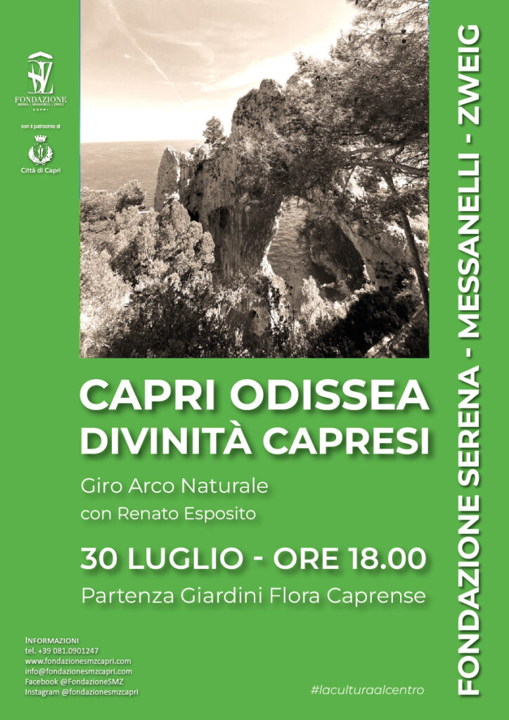 Sempre sulla scia del mito di una Capri omerica, il 30 luglio alle 18 sarà organizzata la passeggiata “Capri Odissea – Divinità capresi” , che vedrà Renato Esposito alla guida di un itinerario che parte dai Giardini della Flora caprense per arrivare all’Arco Naturale.
