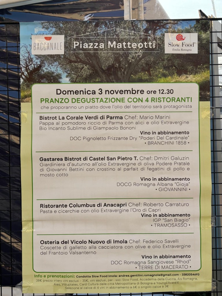 Al termine del convegno nella piazza Matteotti di Imola si è tenuto un pranzo degustazione con i ristoratori delle zone dei progetti illustrati durante l’incontro: “QUATTRO RISTORANTI RACCONTANO L’OLIO EVO”. Ognuno di loro ha proposto un piatto dove l’olio del territorio fungeva da protagonista.