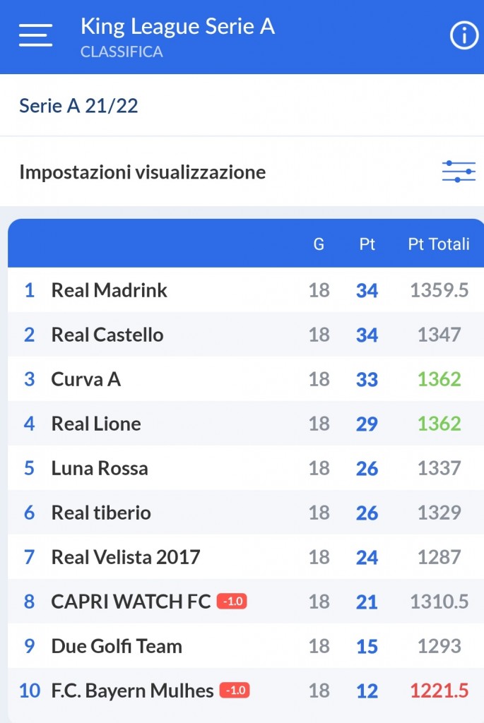 Comincia il girone neutro e vincono le prime tre della classifica che ora ufficialmente sono in lotta per aggiudicarsi il tricolore. Real Madrink, Real Castello e Curva A lanciano la volata che le porterà fino all’ultima giornata. La prima di queste 3, il Real Madrink, passa 2 a 0 contro il Bayer Mulhes grazie a Verdi e Giraud e condanna la squadra di Pezzella ad una sempre più probabile Serie B. La vittoria più importante la ottiene Nicolò Serena, Real Castello, che vince per 4 a 0 lo scontro diretto con il Real Lione mettendo in evidenza un ottimo stato di forma collettivo. Attenzione a Curva A che strapazza Due Golfi per 5 a 1, con il ritorno di Osimhen, Fabrizio Casanova ritrova bonus e possibilità. La situazione di Due Golfi, viceversa si fa sempre più difficile. Luna Rossa vince contro il Real Tiberio un importante scontro diretto in chiave Coppa Uefa, ma è ancora più importante la vittoria di Capri Watch contro il Real Velista. Adesso le squadre distano 3 soli punti ed Alex Staiano e proverà ad evitare gli spareggi per restare in Serie A. Nella prossima giornata arriva un big match scudetto, si affrontano, infatti, Curva A e Real Madrink.