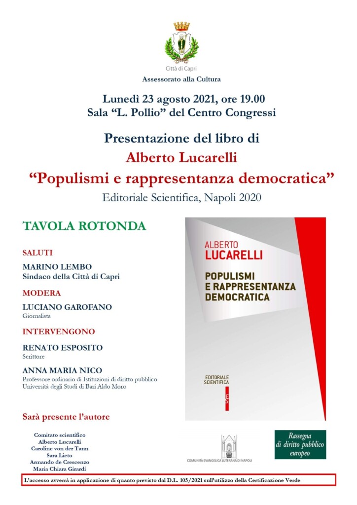 Lunedì 23 agosto a Capri presentazione del libro di Alberto Lucarelli “Populismi e rappresentanza democratica”