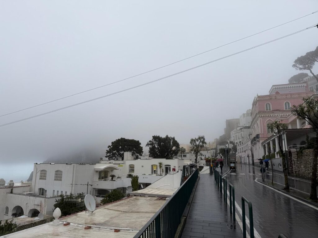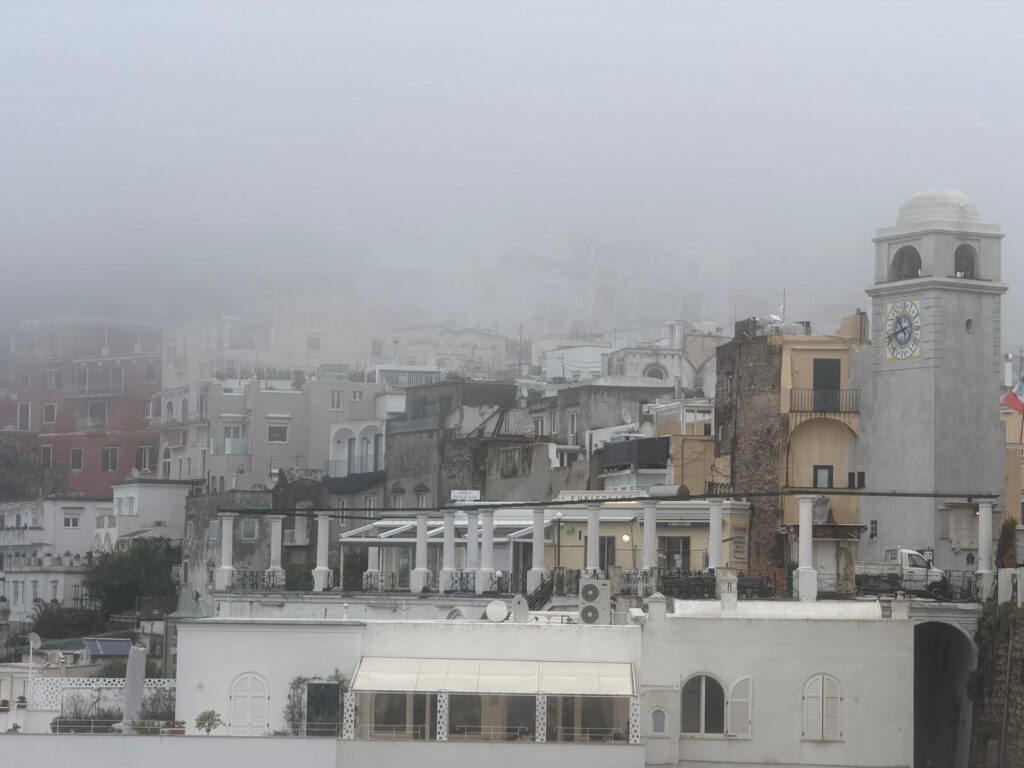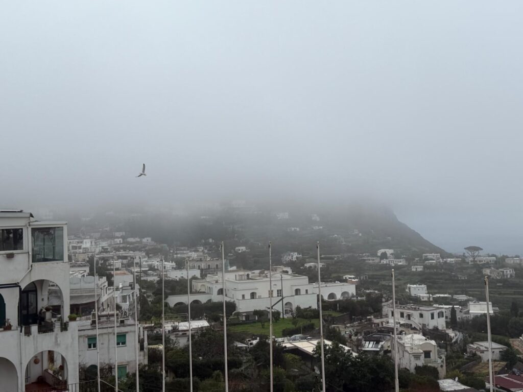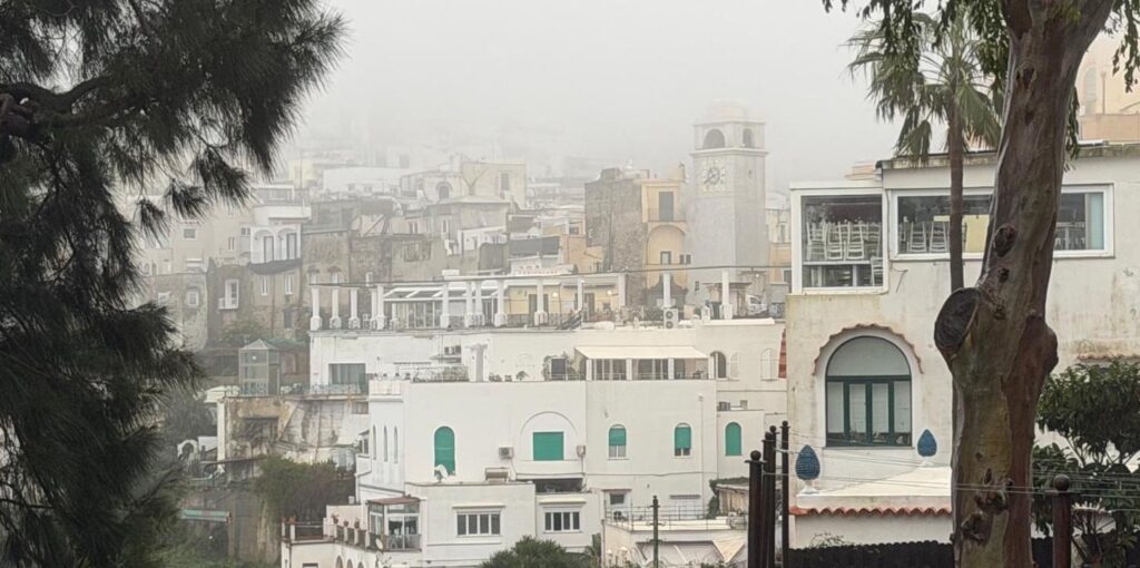 Capri si è svegliata questa mattina in un’atmosfera simile a quella milanese. Una fitta coltre di nebbia ha invaso i luoghi simbolo dell’isola azzurra dall’antica torre campanaria che troneggia nel salotto del monto, in questi mesi priva dei colorati tavolini all’esterno dei bar, alla Piazzetta Funicolare dove è stato oscurato il meraviglioso panorama del golfo di Napoli, il Vesuvio, estendendosi fino alla punta di Monte Solaro che fa da cornice naturale al luogo più celebrato e decantato da poeti e dipinto da artisti di tutto il mondo.