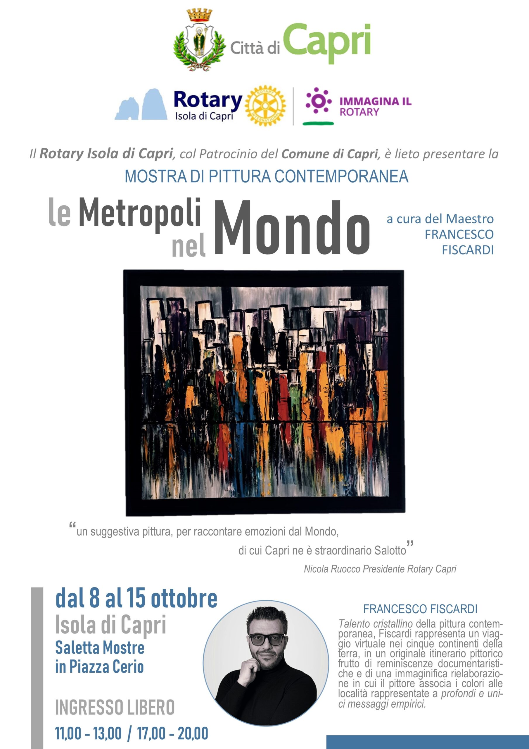 Dal 08 al 15 ottobre, il Rotary Club Isola di Capri, presso la sala mostre del Comune di Capri sita in Piazzetta Ignazio Cerio, 10, organizza e promuove la Mostra di Pittura contemporanea Metropoli del Mondo, suggestiva personale del Maestro Francesco Fiscardi. L’iniziativa si colloca nella rievocazione della giornata mondiale del contemporaneo, che si celebra proprio il giorno 8 ottobre. “Una mostra molto particolare, suggestiva e da toni fortemente evocativi – afferma il Presidente del Rotary Capri Nicola Ruocco – che racconta peculiarità ed emozioni dal Mondo, di cui Capri ne è straordinario Salotto. Una matrice di forte connotazione internazionale che è una delle visioni più caratterizzanti del nostro Club. Ringrazio la Città di Capri , il Sindaco Marino Lembo e Luciano Garofano per il prezioso supporto”. La Mostra è liberamente aperta al pubblico.