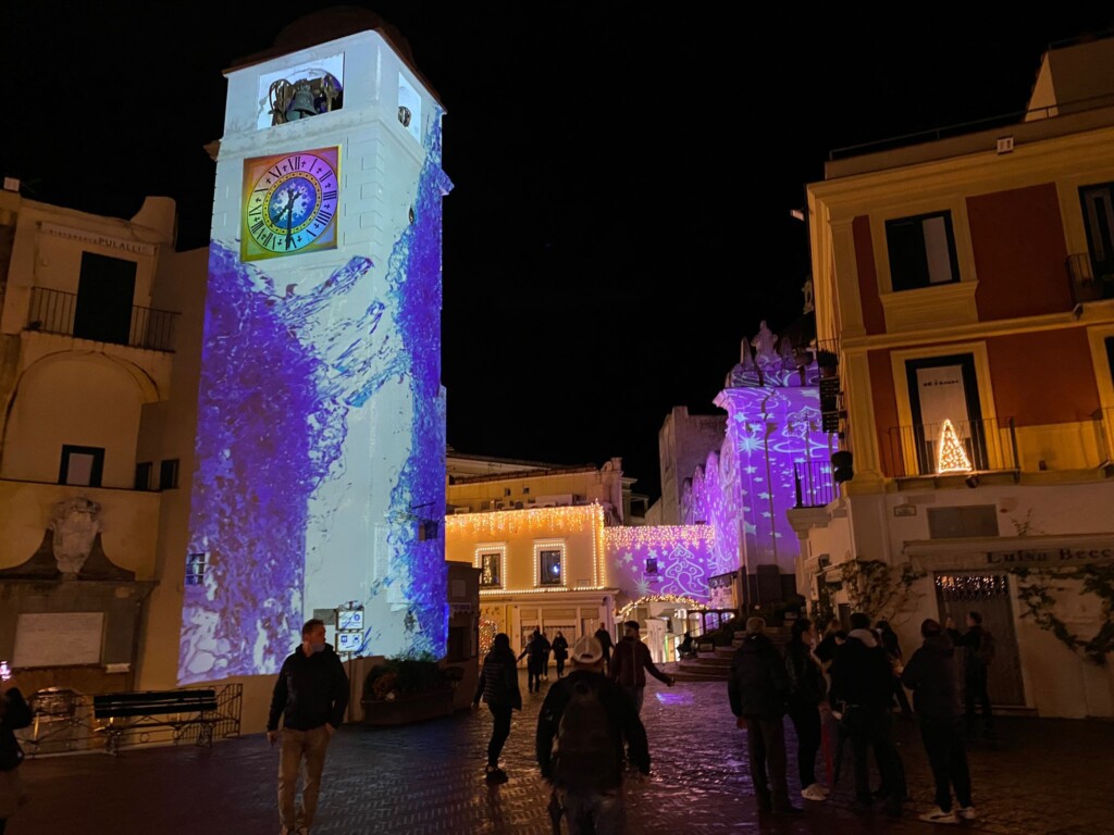 La Piazzetta di Capri da questa sera si è rivestita dell’atmosfera natalizia. Il Comune quest’anno ha voluto che il Salotto del Mondo diventasse il simbolo, grazie al Natale, di tre elementi l’arte, l’ambiente e la tradizione. E’ stato questo lo slogan lanciato dal Sindaco Marino Lembo, alla presenza della Giunta municipale e tanti cittadini, quando alle 19 in punto si è accesa la Piazzetta in versione natalizia ed il grande campanile, muto testimone nei secoli che scandisce l’ora di Capri, si è trasformato in una video installazione dal nome simbolico Endless Blue creata dall’artista fiorentino Michelangelo Bastiani, diventato famoso per i suoi ologrammi e proiezioni interattive. L’artista scelto dal Comune di Capri quest’anno proprio per la simbologia che si è voluta dare al Natale. La video installazione, infatti, consiste in un corso d’acqua simile ad una cascata che incessantemente scorre lungo gli oltre 30 metri dell’iconico Campanile nel “Salotto” del Mondo: Il Comune di Capri ha voluto dare un segnale forte legando il Natale a tre importanti elementi l’acqua, la natura e la tradizione con il coloratissimo albero di Natale. E proprio a queste tematiche si è voluto legare il Sindaco Marino Lembo al momento dell’accensione sottolineando che «con questo Natale e gli altri che vorranno si vuole dare più attenzione alle tradizioni, alla famiglia, all’ambiente ed all’arte. Per tale motivo abbiamo voluto puntare a qualcosa che fosse d’impatto, con il nostro campanile e la cascata d’acqua che da un valore visivo e concettuale, non strettamente connesso al Natale ma evocativo e spettacolare». Infine in conclusione visto il successo ed il plauso ricevuto dal Sindaco e l’amministrazione Marino Lembo conclude: «Le nuove generazioni sono attratte dai media digitali , in questo modo indirizziamo all’arte anche i più giovani e mettiamo in relazione le più innovative tecniche contemporanee con un bene storico-monumentale». Infine l’artista toscano Michelangelo Bastiani nel commentare la sua opera che ha inondato di luci la Piazzetta ed il campanile ha dichiarato che «Endless Blue è una videoinstallazione che ho realizzato per il Comune di Capri in occasione delle feste di Natale e la location è ovviamente legata alla religione, alla città di Capri ed al simbolo che è il campanile. Quindi ho utilizzato un simbolo che uso nelle mie opere che è l’acqua e collegarlo alla torre campanaria che nel mondo è diventato il centro della città e che apre l’ingresso alla Piazzetta che è il punto di riferimento per chiunque venga a visitare l’isola. Ci tenevo a fare un’installazione, un video mapping tridimensionale che coinvolge la facciata ed i due lati creando un involucro d’acqua che avvolge lo storico campanile».