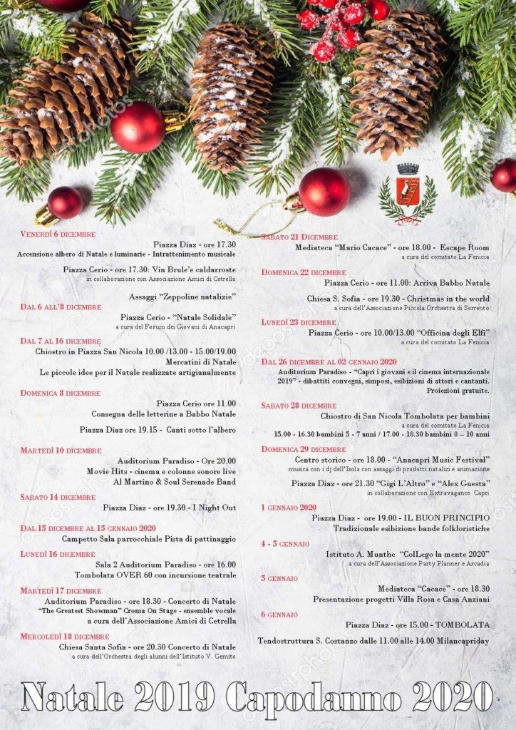 Un’altra significativa tranche di eventi culturali sarà rappresentata dal progetto “Aspettiamo il Natale… 2019”, finanziato dalla Camera di Commercio e organizzato dal Comune di Anacapri in collaborazione con la Fondazione Napolitano. Si tratta di un programma anche qui molto variegato, che spazierà da una passeggiata nel centro storico di Anacapri, arricchita da un reading natalizio organizzato in collaborazione con il Forum dei Giovani di Anacapri, a ben quattro concerti molto diversi da loro: dal Gospel del Mighty Choir alla musica classica del Sestetto d’archi Napolitano, dal Jazz del sassofonista Giulio Martino alla musica da film con l’ensamble I suoni del Sud.