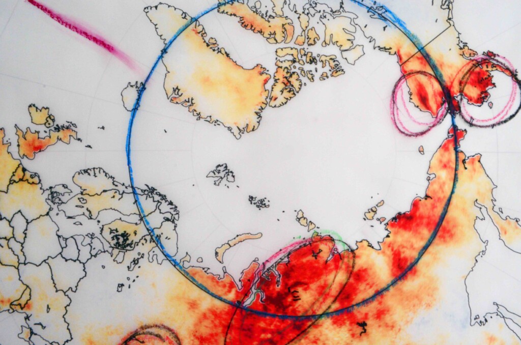Nella settima sala, in Climate Anomalies Evidence, l’artista è intervenuto con pastelli ad olio su mappe e fotografie satellitari fornite dalla NASA che attestano le anomalie più significative inerenti alle temperature, al problema della siccità, degli incendi e delle inondazioni, per dimostrare l’intensificazione esponenziale di questi fenomeni negli anni.
