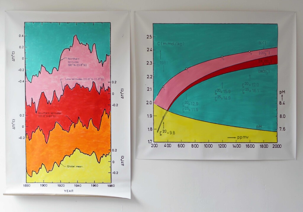 Nell’ottava sala, in Climate Legal Evidence, l’artista realizza un intervento pittorico realizzato su due grafici degli anni ’80 risultanti da studi commissionati e condotti internamente dalle compagnie Shell e Exxon, dai quali emergeva già in quegli anni con evidenza l’impatto climalterante che avrebbe avuto l’utilizzo delle fonti fossili sul lungo periodo. Questi stessi documenti sono rimasti segreti per molti anni, di recente sono emersi come prove nelle cause legali contro la compagnie Shell ed Exxon.