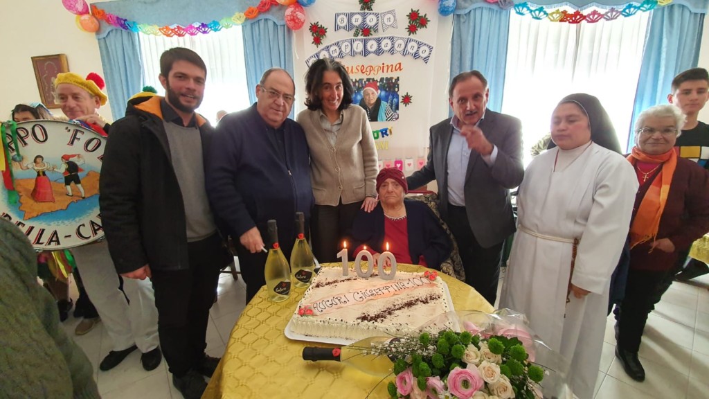 Capri, isola di Centenari. Nella casa di riposo San Giuseppe sono stati festeggiati i primi 100 anni della signora Giuseppina Cacace, ospite del ricovero per anziani. Nella foto, i familiari della signora Giuseppina con il Sindaco Marino Lembo, il Parroco di Capri don Carmine Del Gaudio con il viceparroco don Nello e l’Assessore alla Cultura Paola Mazzina che sono intervenuti alla cerimonia in onore della festeggiata.