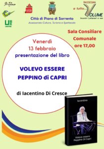 Il Comune di Piano di Sorrento, Assessorato Cultura, Turismo e Spettacolo, presenta venerdì 13 febbraio 2026 alle ore 17:00, nella Sala Consiliare Comunale, la presentazione del libro “Volevo essere Peppino di Capri” di Iacentino Di Cresce. L’evento, realizzato nell’ambito della rassegna culturale “A tutto… Volume – Incontri Letterari e non”, è a ingresso libero.